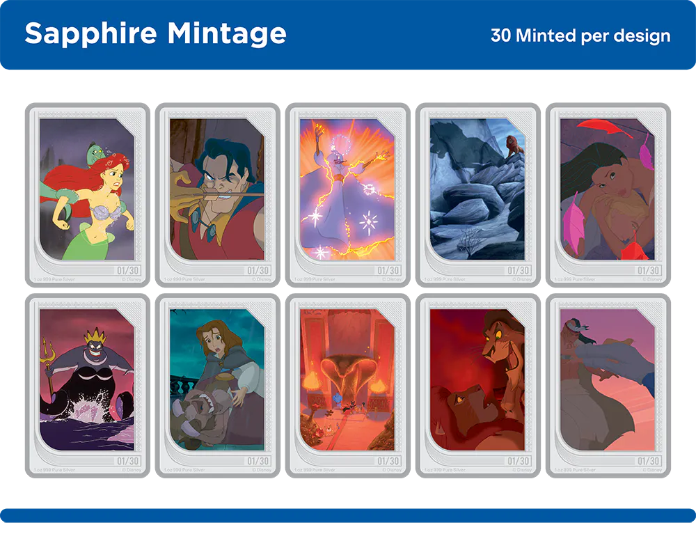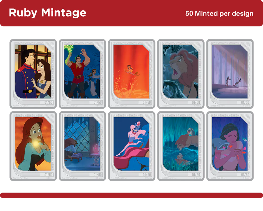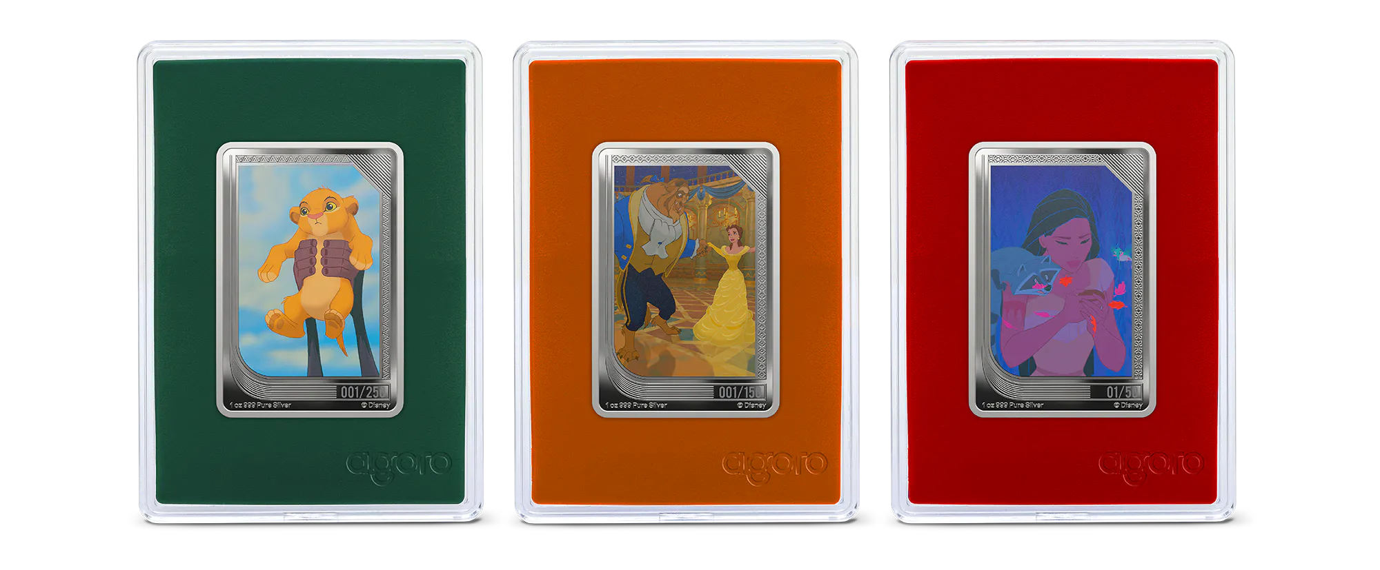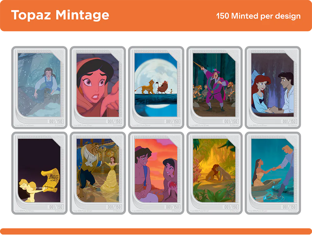 Each coin in the Disney Renaissance Trading Coins collection ranges from 1oz of 999 pure silver, to silver gilded in gold, to ¼oz of solid gold, culminating in the 1oz 9999 pure gold chase.
